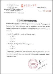 La Délégation générale au Pèlerinage aux Lieux saints de l’islam porte à l’attention des futurs pèlerins que les documents de voyages seront distribués au hangar du pèlerin sis à l’aéroport de Yoff selon le calendrier suivant :