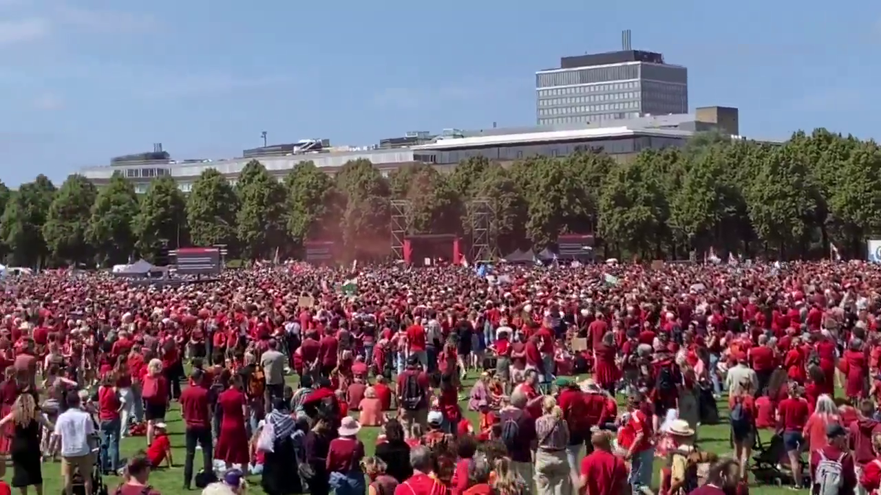 Vêtus de rouge, des dizaines de milliers de manifestants ont défilé dimanche 15 juin dans les rues de La Haye (Pays-Bas) pour demander au gouvernement néerlandais de prendre davantage de mesures contre ce qu’ils ont qualifié de « génocide » à Gaza.